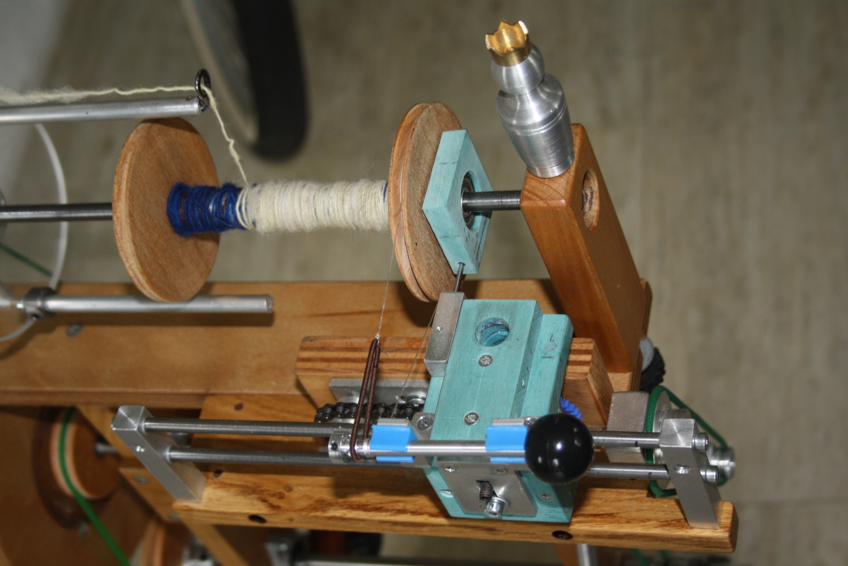 den besonderen Bedarf ab. Der Spinnkönig ist ein mit 2 Riemensystemen drehender Mechanismus. 1. Riemen vorn, treibt die Spinnstufe vorne an. 2. Riemen hinten,arbeitet als Antrieb für den grünen Legeschlitten mit langsamer Drehzahl. Das Spinnrad ist doppeltrittig und wickelt automatisch die Spule mit Garn gleichmäßig voll. Der Spinnkopf ist 2-fach gelagert, hinten schnell zu öffnen, um die Spule zu wechseln. Der Wellendurchmesser ist 8 mm, die Spulenmaße sind D 80 x 130 mm. Die Spinnübersetzung ist ca. 1:8.